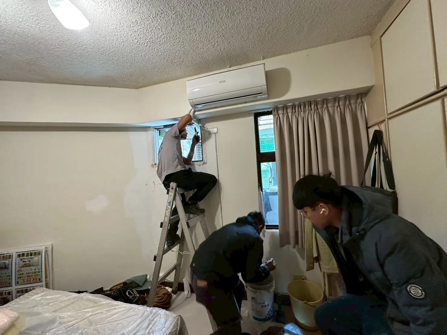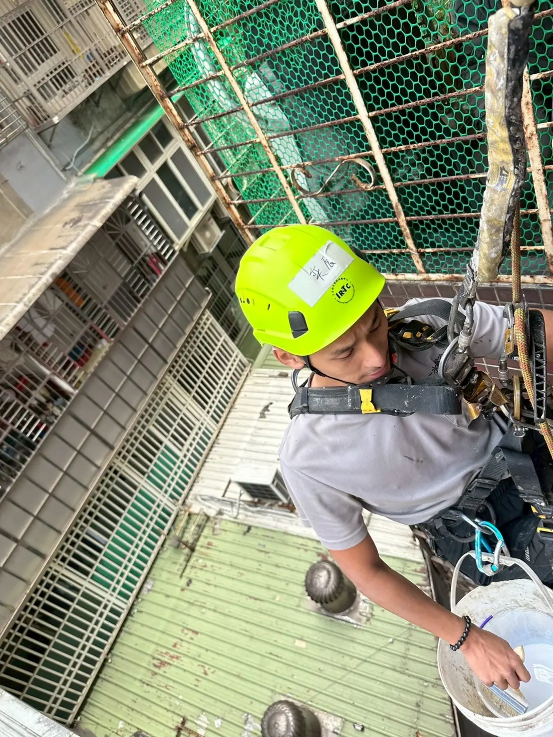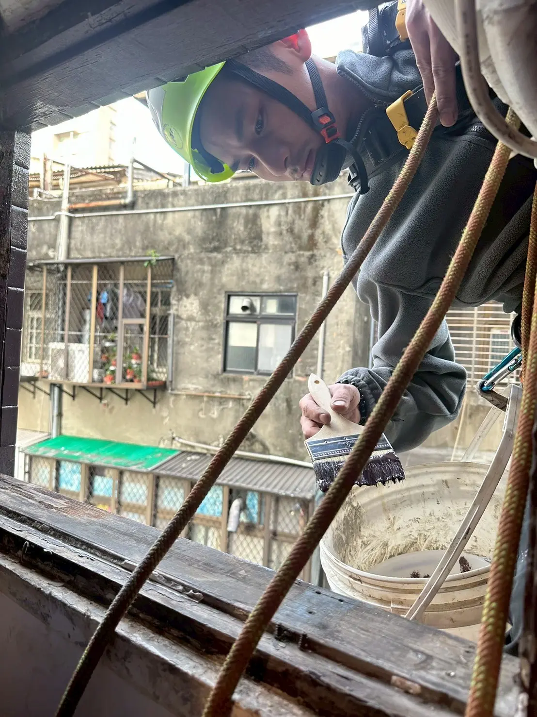 到場後,考量施工位置位於外牆,若搭設鷹架成本過高且影響巷道,因此採用高空繩索作業垂降至定位。為了讓全新的不鏽鋼遮雨棚能順利安裝,師傅先使用砂輪機將局部阻礙動線的老舊鐵窗進行切割與調整。隨後,將上方已預先貼好人工草皮的遮雨棚牢固鎖附於外牆面上,並針對窗台底部與木窗框交界處,以毛刷仔細塗佈防水塗料,確實填補老化縫隙與潛在的漏水點。
