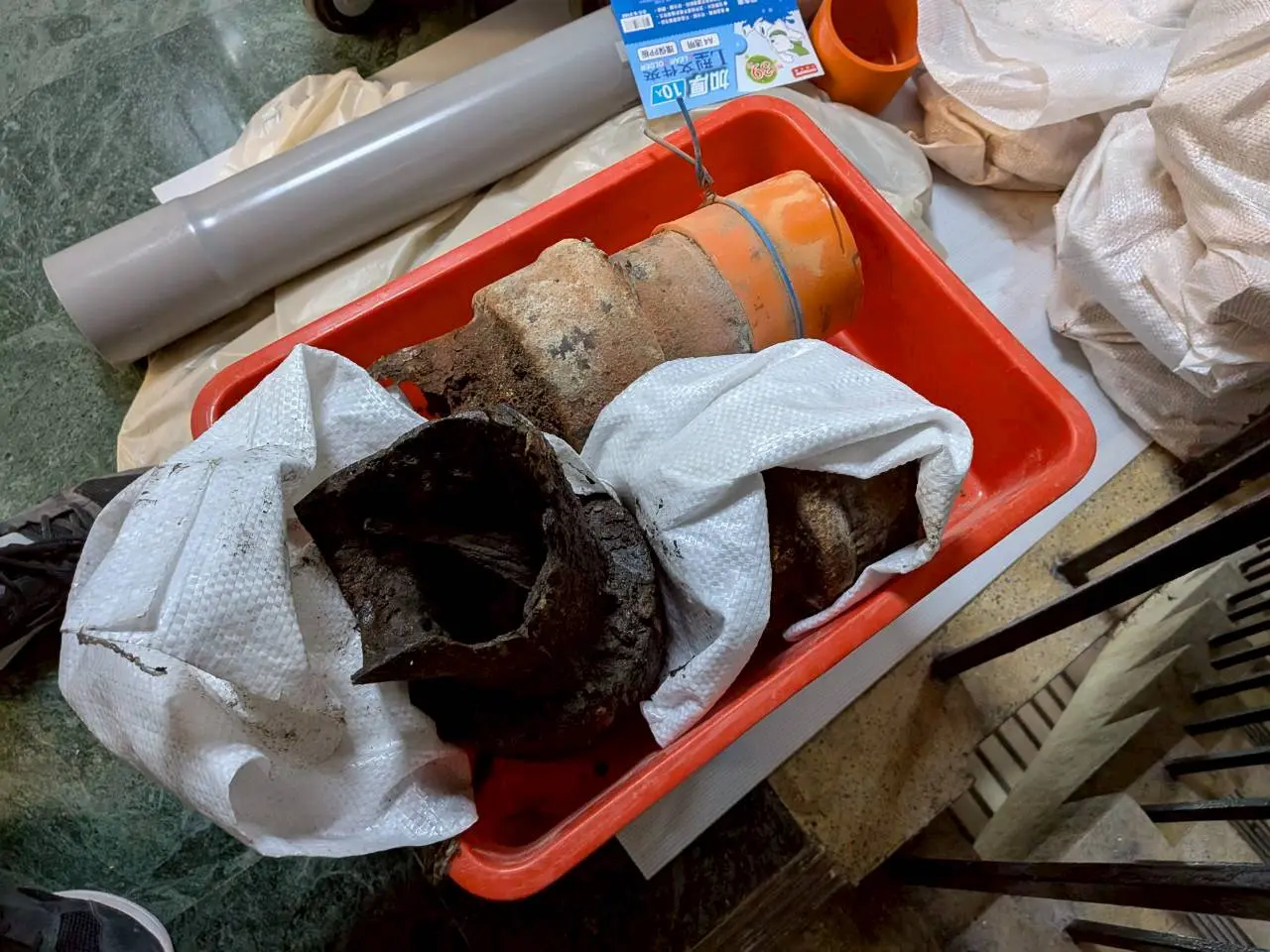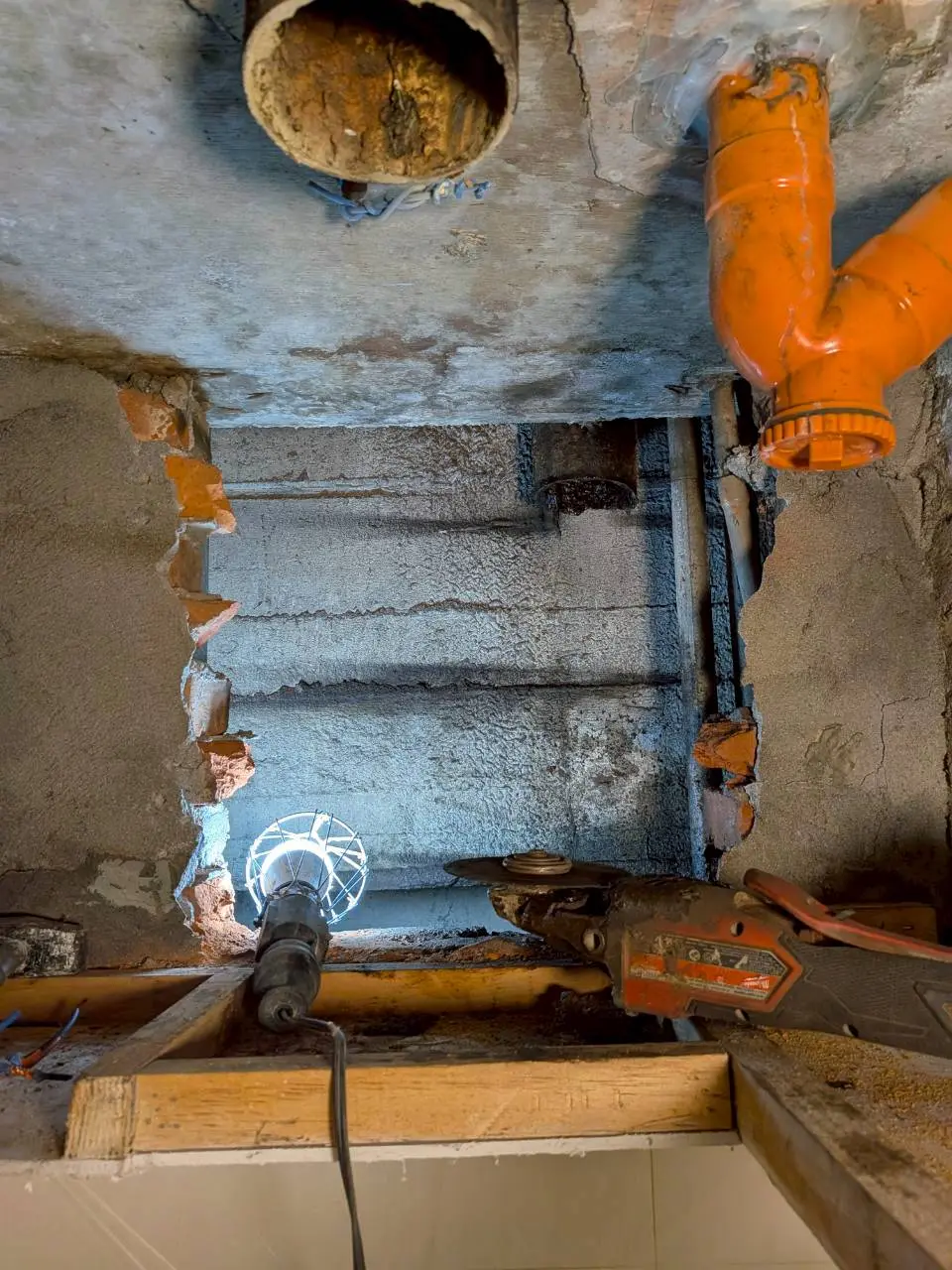 到場後,師傅先從天花板檢修孔進入,並局部打除管道間周圍的磚牆,確實抓出持續滴水的鑄鐵管破裂位置。確認漏水範圍後,隨即進入拆除與更新階段。隨後換上耐候性佳、抗腐蝕的全新橘色與灰色PVC厚管重新配置。